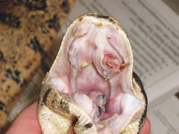 Mouth rot is a bacterial infection caused by injuries or poor hygiene. Affected snakes develop swollen, pus-filled mouths and may stop eating. Treatment involves cleaning wounds and administering antibiotics. Proper enclosure hygiene and careful handling reduce the risk of mouth rot.